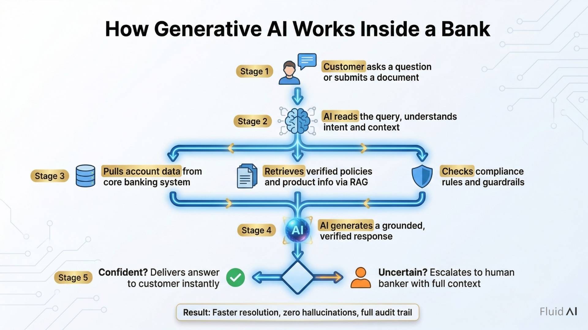 The key distinction: generative AI doesn't just retrieve pre-written answers. It generates contextually relevant responses based on the customer's specific situation, account history, and the bank's policies.