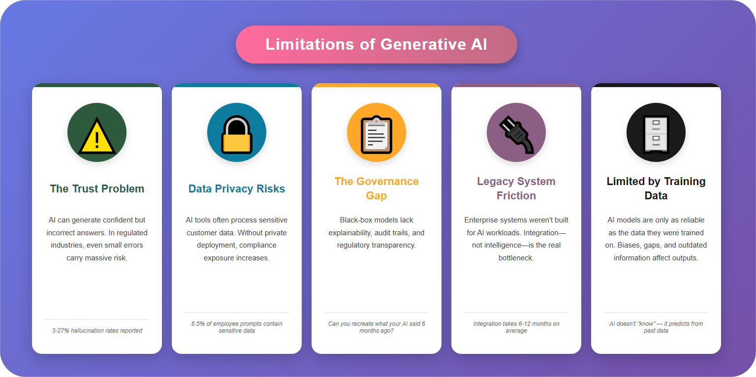 Discover the top 5 limitations of generative AI in 2026, from hallucinations and data privacy risks to governance gaps, legacy integration challenges, and compliance barriers.